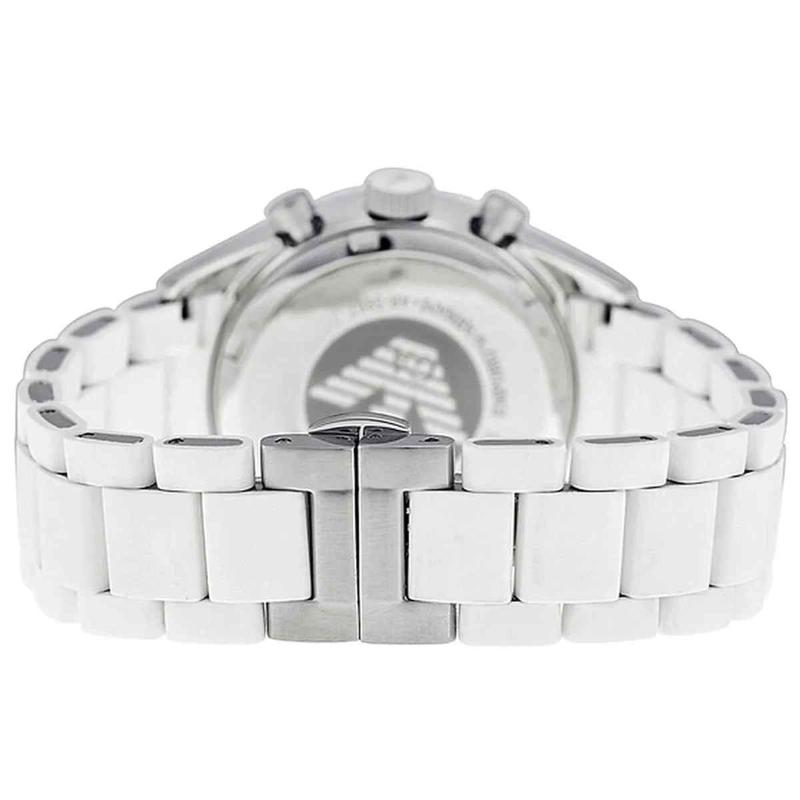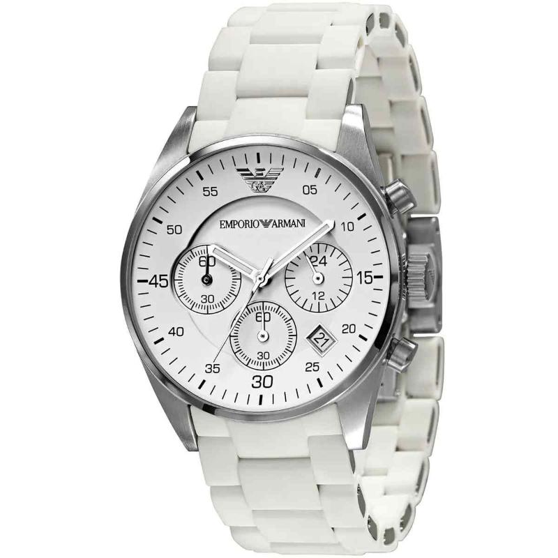 The Emporio Armani AR5867 from the Sportivo collection is a chic and functional ladies’ chronograph. This 37mm watch features a polished stainless steel case and a clean white chronograph dial equipped with three sub-dials and a date window. The watch is completed by a comfortable and distinctive white rubber/silicone strap (often featuring stainless steel links for durability). Powered by a reliable quartz chronograph movement and water-resistant to 50 meters, the AR5867 is a versatile accessory that blends reliable timekeeping with a sophisticated, sporty aesthetic.