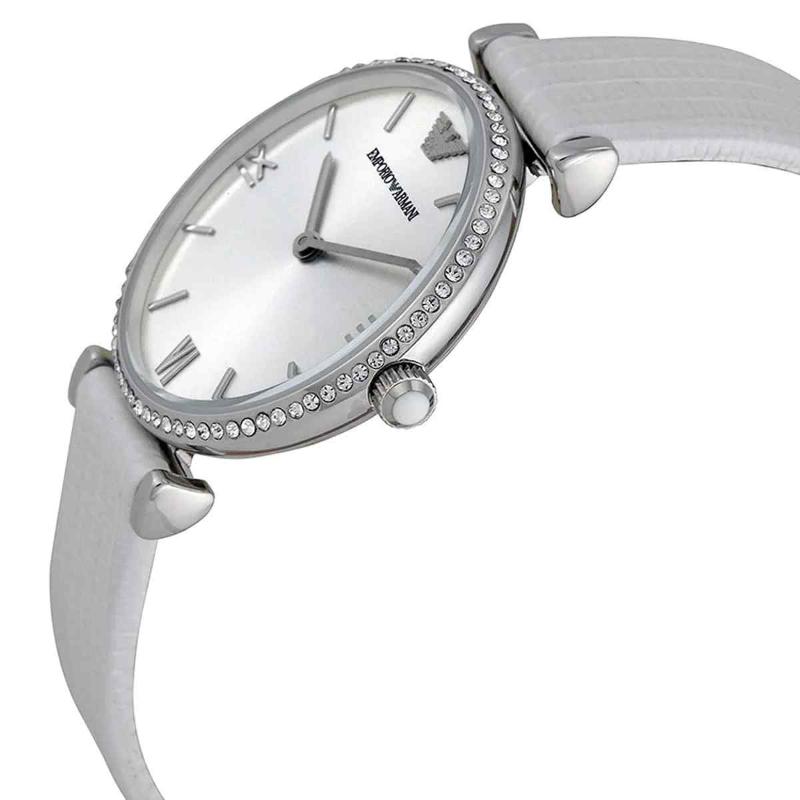 The Emporio Armani AR1680 from the Gianni T-Bar collection is a sophisticated and feminine timepiece. This 32mm ladies’ watch features a polished stainless steel case. The bezel frames an exquisite Mother of Pearl dial, which shimmers beautifully and is accented by silver-tone indices and hands. The watch is completed by a refined white genuine leather strap, secured with a buckle. Powered by a reliable quartz movement and water-resistant to 30 meters, the AR1680 is a perfect blend of delicate design and enduring elegance.