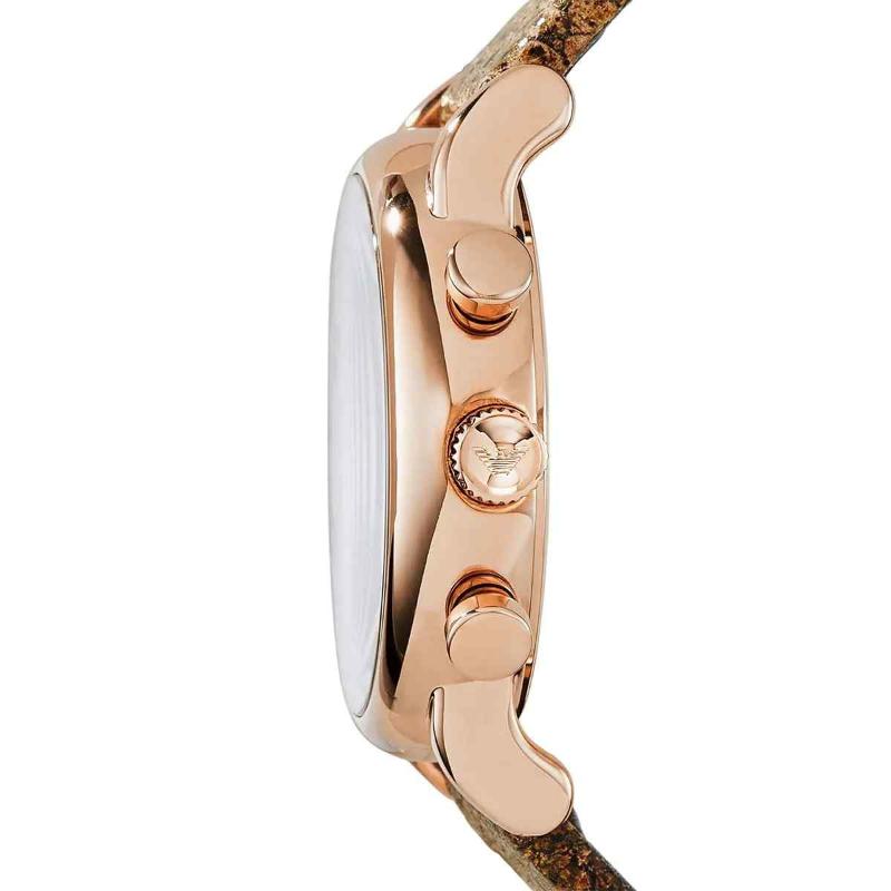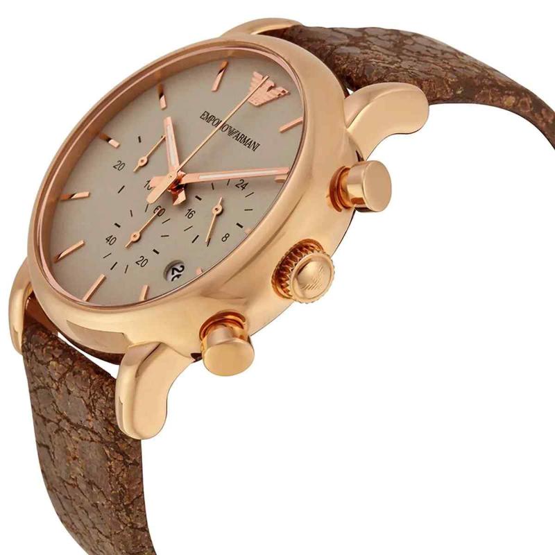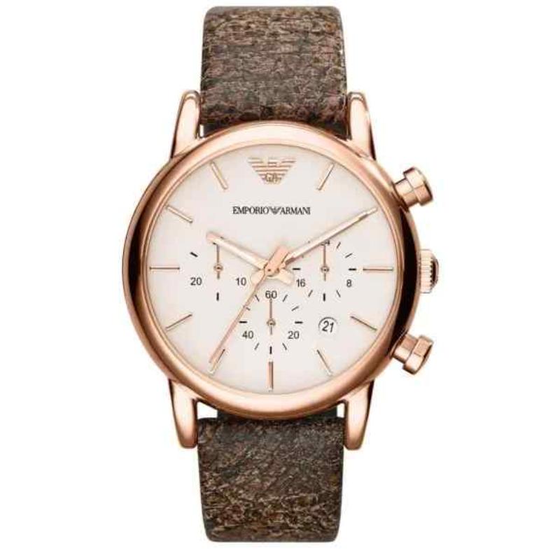 The Emporio Armani AR1809 is a highly sought-after chronograph known for its refined, vintage-inspired aesthetics. This 41mm men’s watch features a polished rose gold PVD-plated stainless steel case. The fixed bezel frames a bright cream/beige dial equipped with three functional sub-dials and a date window. The warm tones of the rose gold are perfectly complemented by a dark brown genuine leather strap. Powered by a reliable quartz chronograph movement and water-resistant to 50 meters, the AR1809 is an essential, sophisticated accessory for the modern gentleman.