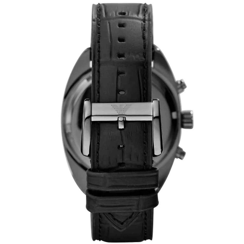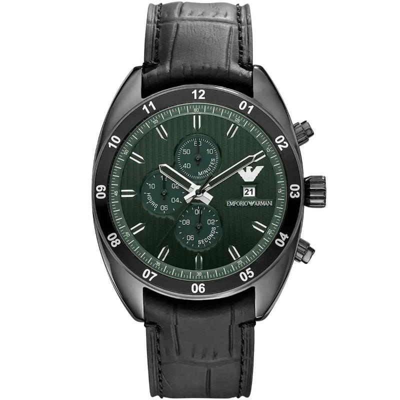 The Emporio Armani AR5917 from the Sportivo collection is a modern and visually dynamic men’s chronograph. This 43mm watch is housed in a robust black IP stainless steel case, offering a sleek, dark frame. The stunning green sunray dial provides a rich pop of colour, equipped with chronograph sub-dials and luminous indices. The watch is completed by a comfortable and classic black genuine leather strap. Powered by a reliable quartz chronograph movement and water-resistant to 50 meters, the AR5917 is a high-fashion accessory that delivers precision timing and bold, contemporary style.