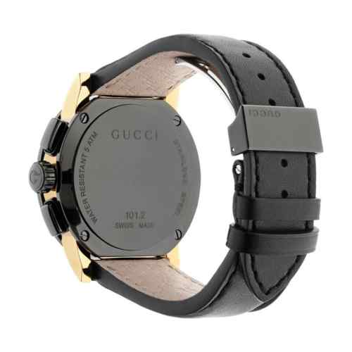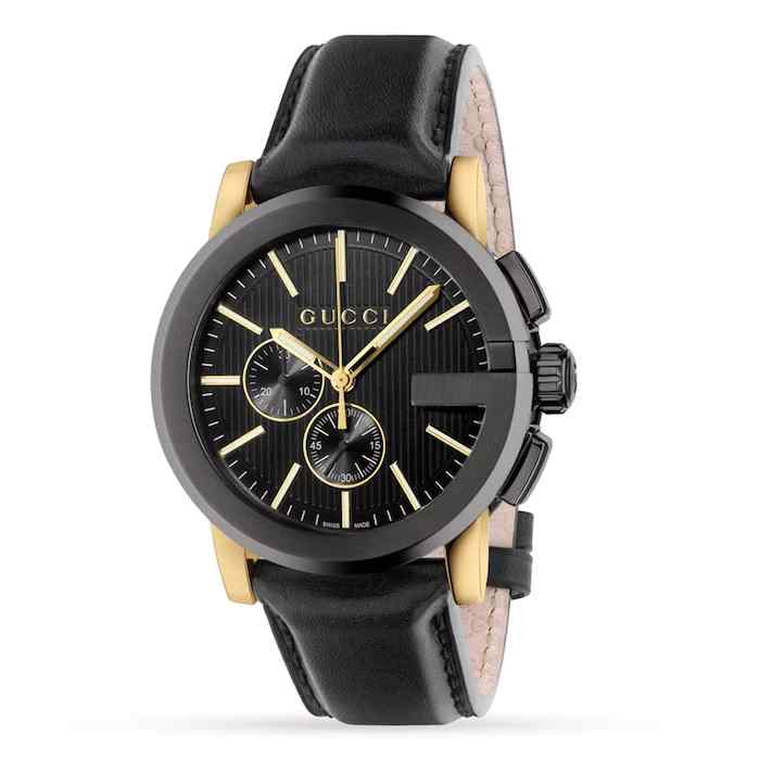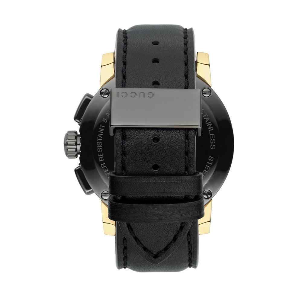 Elevate your wristwear with the bold and contemporary Gucci G-Chrono (YA101203). This magnificent 44mm men’s chronograph features a durable black PVD stainless steel case and bezel with stylish light yellow gold PVD detailing. The striking black guilloché dial includes baton hour markers and chronograph sub-dials for precision timekeeping. The watch is secured with a handsome black leather strap, making it a powerful statement piece that perfectly captures Gucci’s blend of modern luxury and traditional Swiss quality.