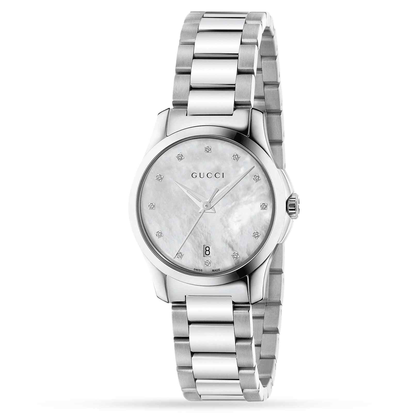 The Gucci G-Timeless (YA126542) is an exquisite and elegant ladies’ timepiece that offers a luxurious blend of classic design and dazzling details. This 29mm ladies’ watch is expertly crafted from polished stainless steel, including its sleek case and the seamlessly integrated H-link bracelet. The captivating iridescent white mother-of-pearl dial is the true centerpiece, shimmering with subtle shifts of colour and adorned with sparkling diamond hour markers that add undeniable brilliance. Silver-tone hands ensure clear legibility, while a practical date display is positioned at 6 o’clock. Protected by a durable sapphire crystal and driven by a reliable Swiss quartz movement, this piece offers an elegant and sophisticated aesthetic, perfect for making a statement at any special occasion.