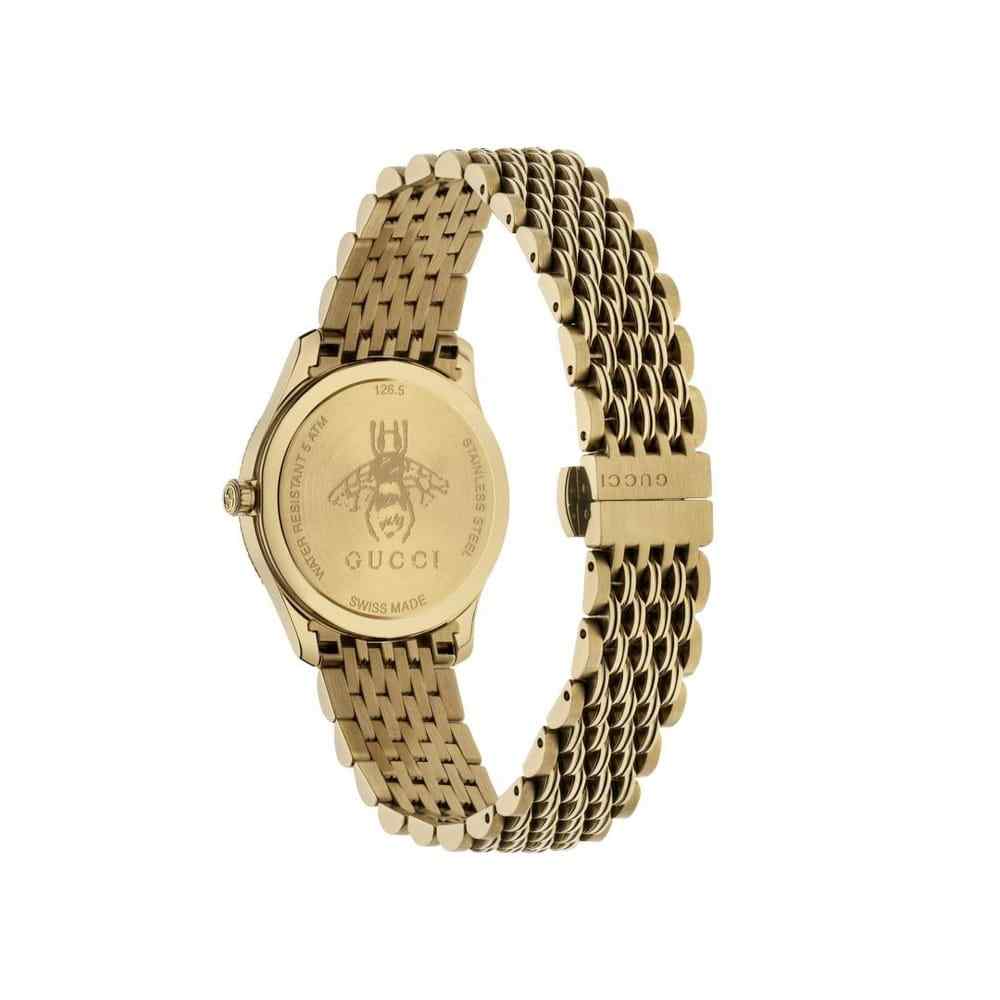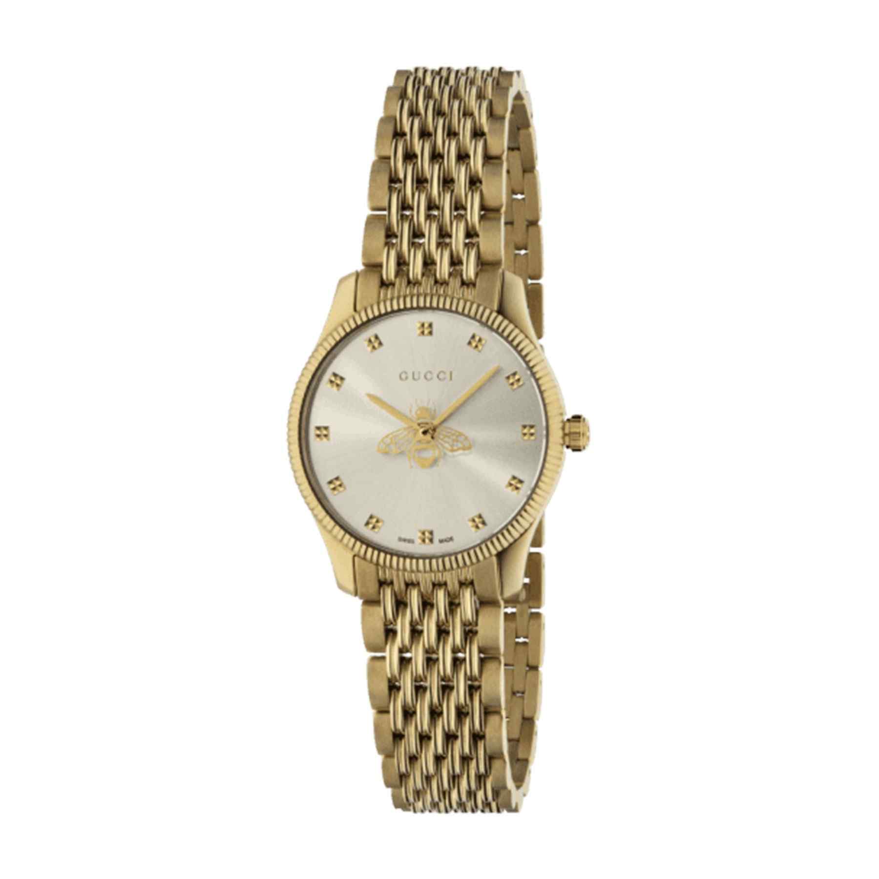 The Gucci G-Timeless (YA1265021) is a truly opulent and distinctive ladies’ timepiece that combines refined luxury with iconic Gucci elements. This 29mm watch is expertly crafted entirely from polished gold PVD-plated stainless steel, including its sleek case which features a charming knurled (fluted) bezel. The captivating gold sun-brushed dial is the focal point, adorned with an iconic gold-tone Bee motif at its center. Uniquely, the hour markers are replaced by a playful assortment of Gucci’s animal and nature motifs, including stars, bees, and hearts, all in a golden tone. The watch is completed by a refined and comfortable gold PVD Milanese mesh bracelet, which provides a smooth, fluid fit. Protected by a durable sapphire crystal and driven by a reliable Swiss quartz movement, this piece offers a unique blend of high fashion, artistic detailing, and Swiss precision.