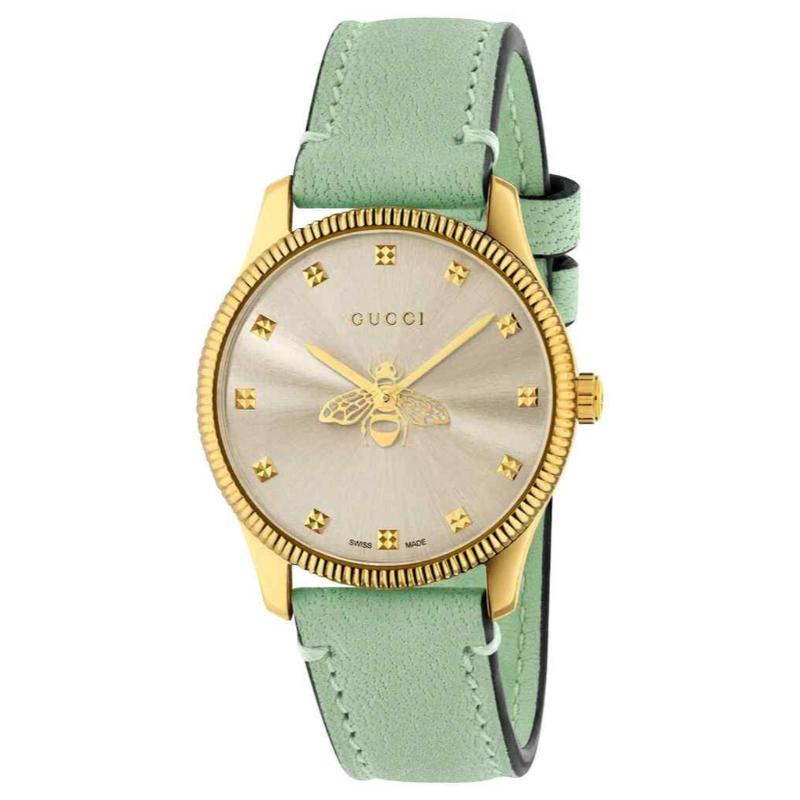 The elegant Gucci G-Timeless YA1265040 features a 29mm polished gold PVD case with a knurled bezel, a sophisticated silver dial adorned with an iconic gold-tone Bee motif and intricate indices, and a genuine light green leather strap.