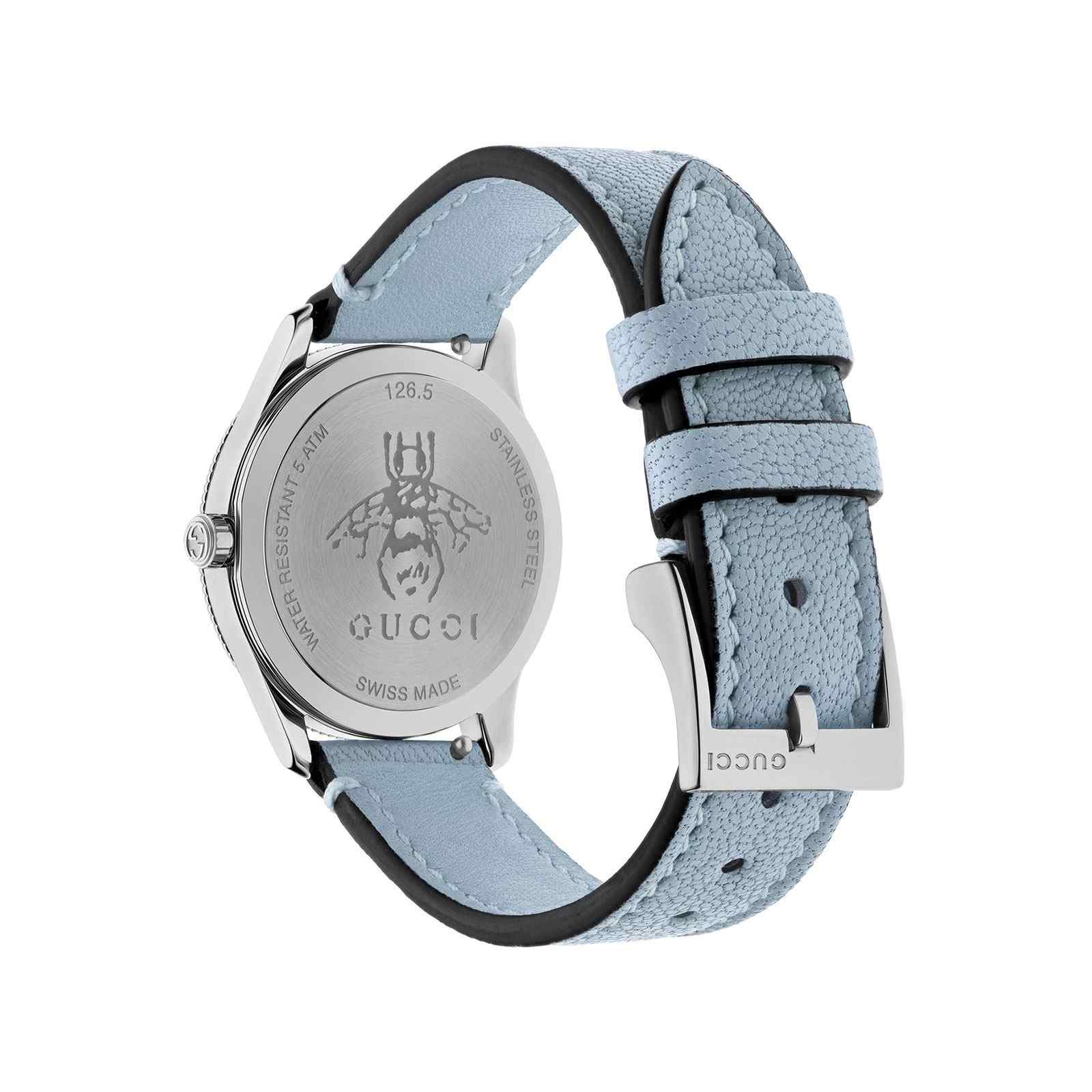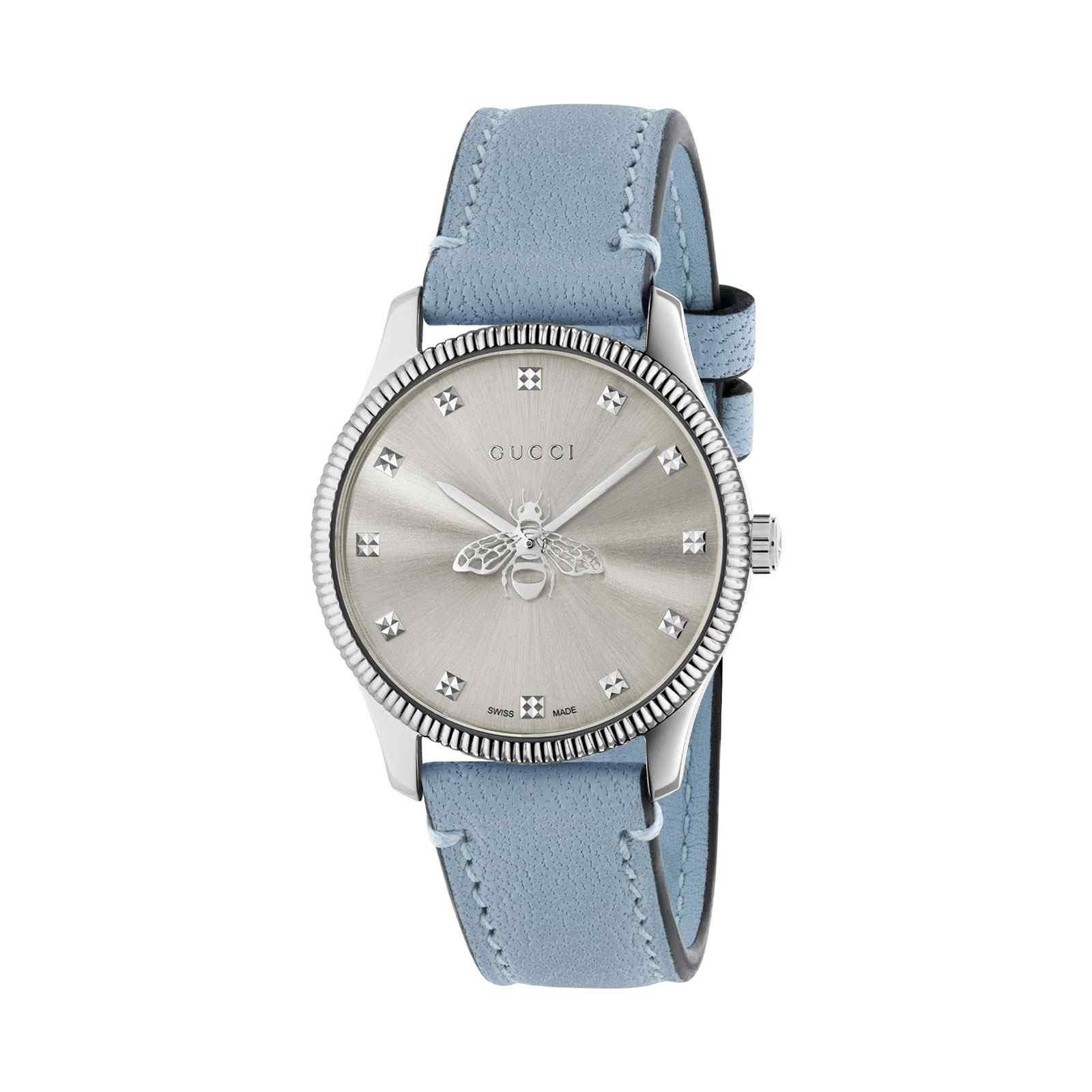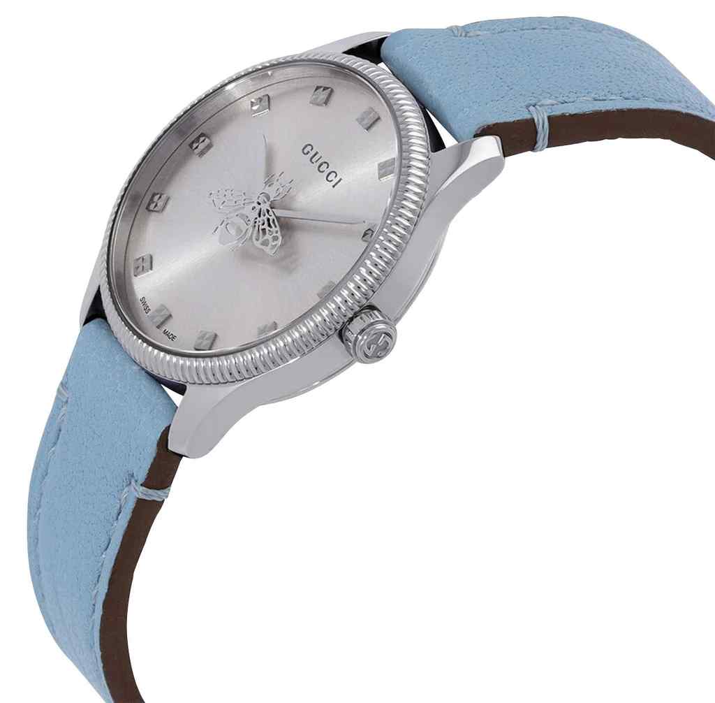 The Gucci G-Timeless (YA1265039) is a charming and distinctive ladies’ timepiece that elegantly combines classic design with signature Gucci elements. This 29mm watch is expertly crafted with a polished stainless steel case, which features a charming knurled (fluted) bezel. The captivating silver sun-brushed dial is the focal point, adorned with an iconic silver-tone Bee motif at its center. Uniquely, the hour markers are replaced by a playful assortment of Gucci’s animal and nature motifs, including stars, bees, and hearts, all in a silver tone. The watch is completed by a refined and comfortable light blue genuine leather strap, offering a fresh and versatile look. Protected by a durable sapphire crystal and driven by a reliable Swiss quartz movement, this piece offers a unique blend of high fashion, artistic detailing, and Swiss precision.