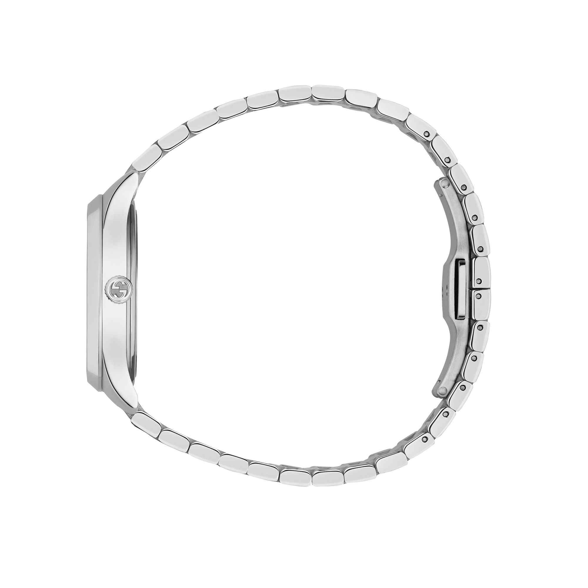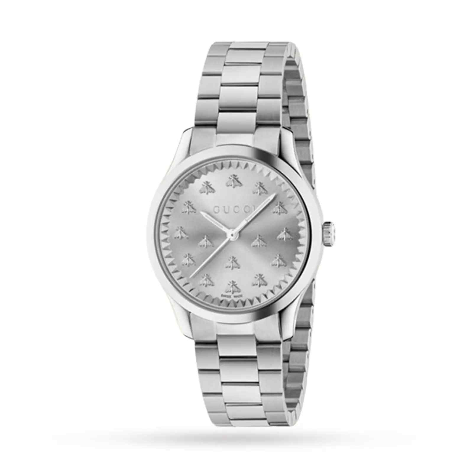 The Gucci G-Timeless (YA1265031) is a charming and distinctive ladies’ timepiece that elegantly combines classic design with iconic Gucci elements. This 29mm watch is expertly crafted from polished stainless steel, including its sleek case which features a charming knurled (fluted) bezel. The captivating silver sun-brushed dial is the focal point, uniquely adorned with multiple silver-tone Bee motifs that serve as the hour markers, adding a playful and instantly recognizable brand touch. The watch is completed by a refined and comfortable stainless steel bracelet, ensuring a classic and versatile look. Protected by a durable sapphire crystal and driven by a reliable Swiss quartz movement, this piece offers a unique blend of high fashion, artistic detailing, and Swiss precision.