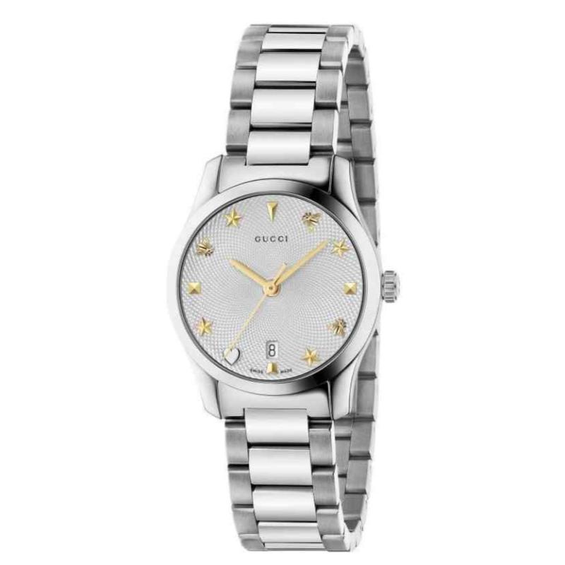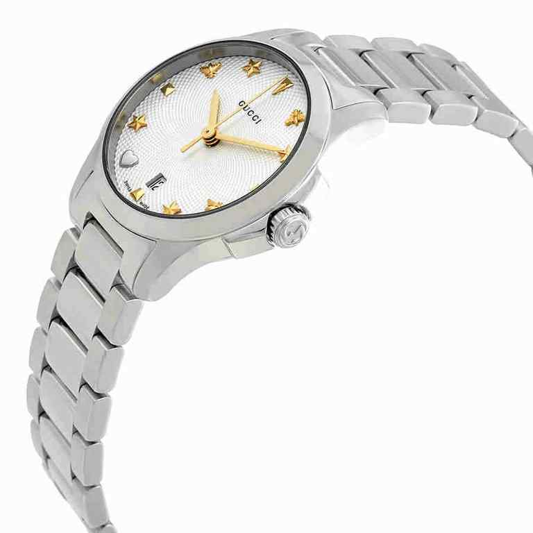 The charming Gucci G-Timeless YA126572A features a 29mm polished stainless steel case, a sophisticated silver dial adorned with playful star and heart motif indices, and a refined stainless steel bracelet.