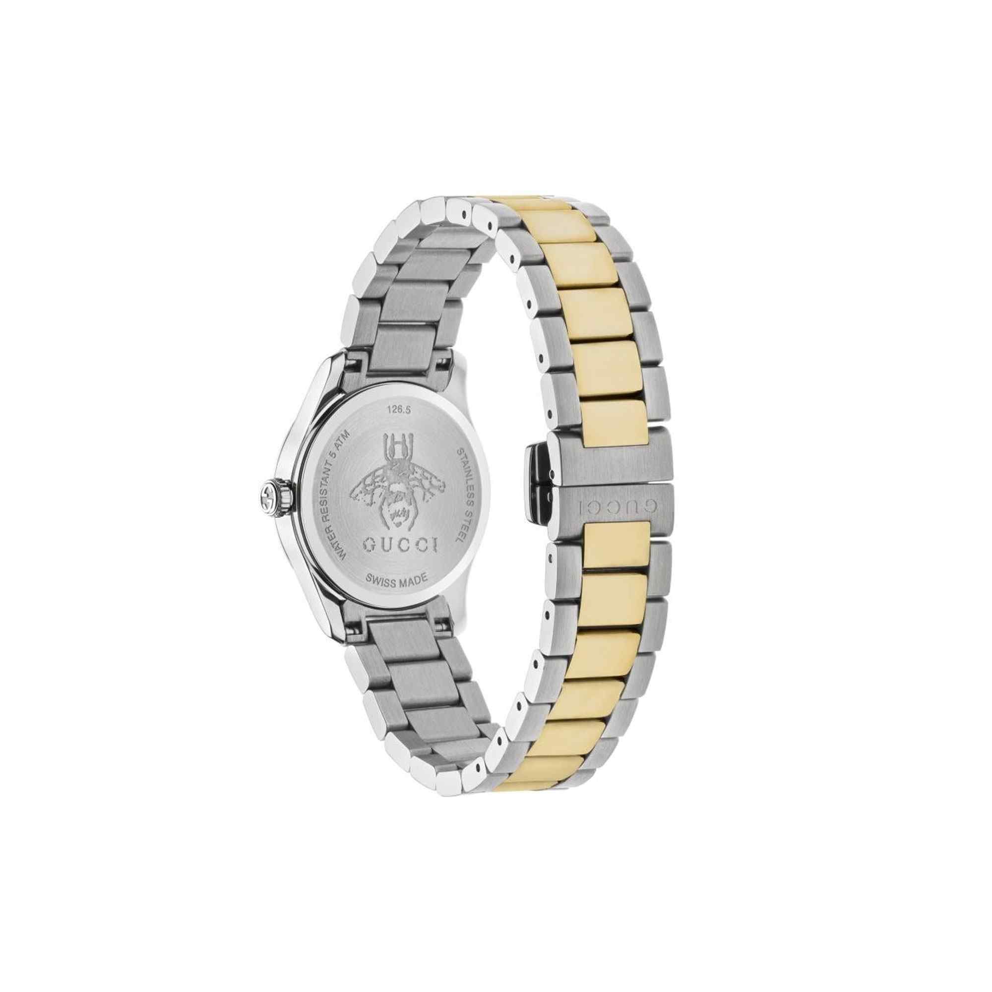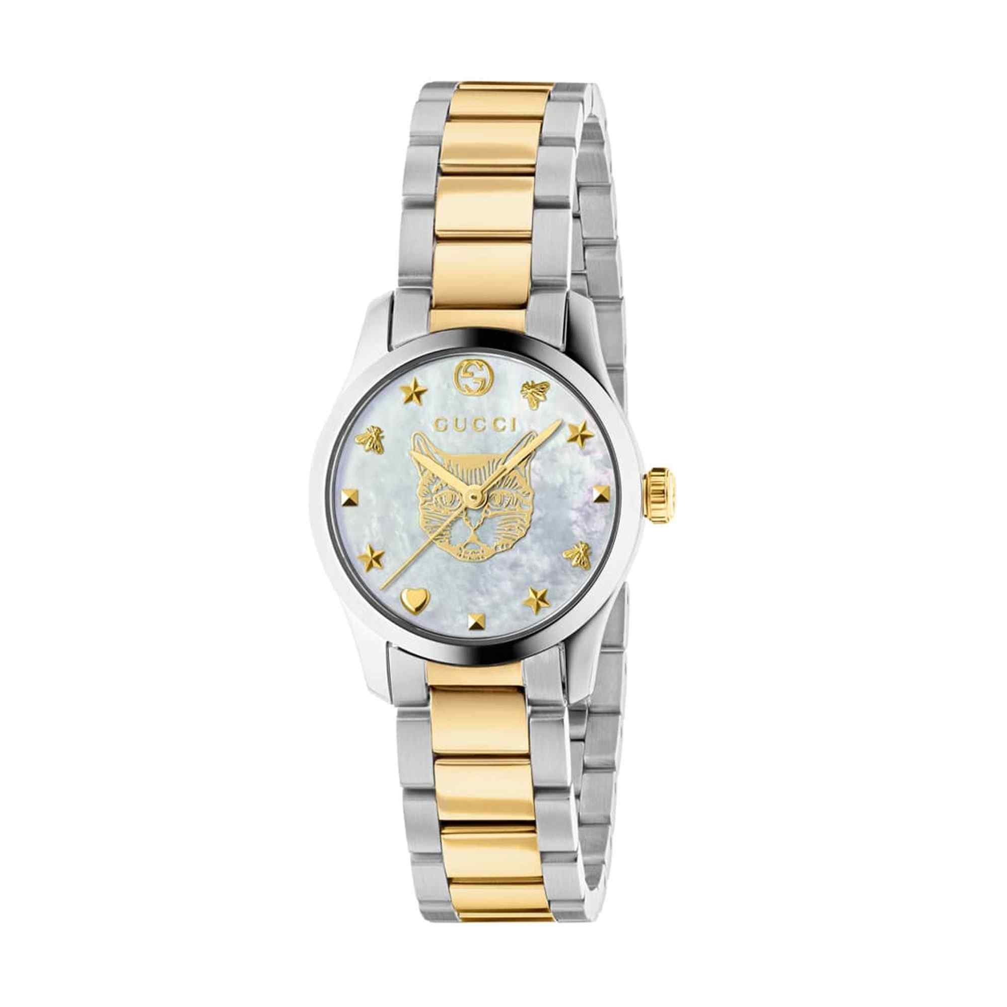 The Gucci G-Timeless (YA1265012) is a charming and distinctive ladies’ timepiece that beautifully showcases Gucci’s playful yet luxurious aesthetic. This 29mm watch is crafted with a sophisticated two-tone design, featuring polished stainless steel for the case and outer bracelet links, elegantly contrasted with yellow gold PVD-plated central links. The captivating iridescent white mother-of-pearl dial is the true centerpiece, adorned with a bold and iconic golden cat head motif at its center. This unique design is further enhanced by various whimsical indices, including stars, hearts, and bees, all in a golden tone. Protected by a durable sapphire crystal and driven by a reliable Swiss quartz movement, this piece offers a unique blend of high fashion, whimsical artistry, and Swiss precision, perfect for those who appreciate distinctive luxury.