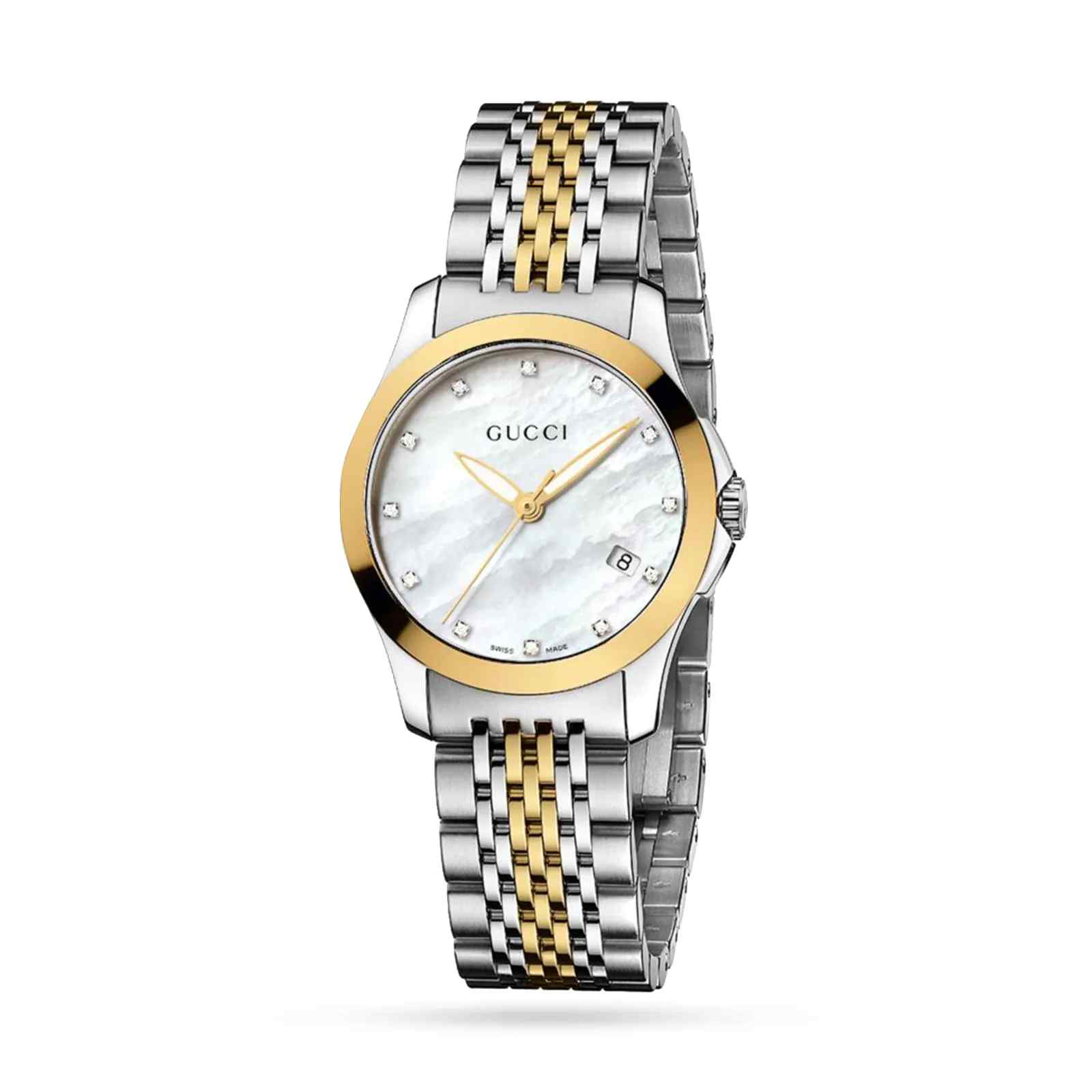 The luxurious Gucci G-Timeless YA126513 features a 29mm polished stainless steel case with a yellow gold PVD bezel, an iridescent mother-of-pearl dial adorned with diamond hour markers, and a refined two-tone stainless steel and yellow gold PVD bracelet.