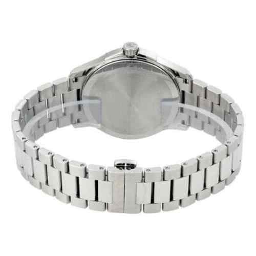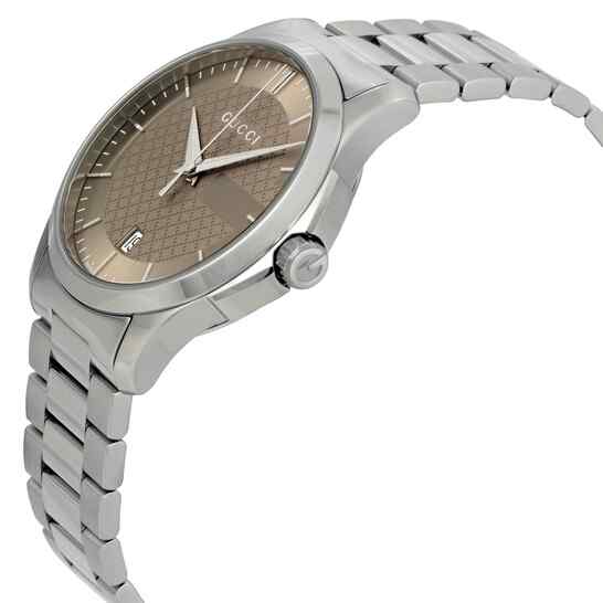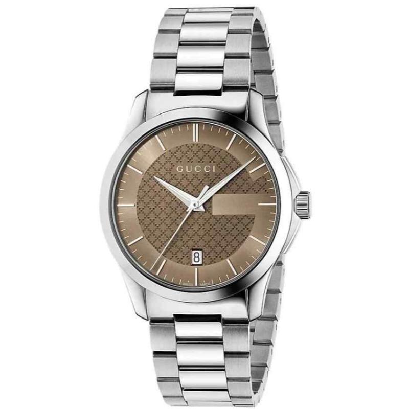 The elegant Gucci G-Timeless YA126445 features a 38mm polished stainless steel case, a sophisticated brown dial with a distinctive “G” pattern, and a refined stainless steel bracelet.