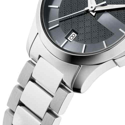 The Gucci G-Timeless (YA126522) is a versatile and elegant timepiece that perfectly blends classic refinement with a contemporary edge. This 38mm unisex watch is expertly crafted from polished stainless steel, including its sleek case and the seamlessly integrated H-link bracelet. The captivating grey sun-brushed dial is the focal point, featuring a unique Gucci “G” motif pattern that adds depth and brand identity. Silver-tone baton indices and hands ensure clear legibility, while a practical date display is positioned at 6 o’clock. Protected by a durable sapphire crystal and driven by a reliable Swiss quartz movement, this piece offers a sophisticated, understated aesthetic that is perfect for any occasion, from formal events to daily wear.