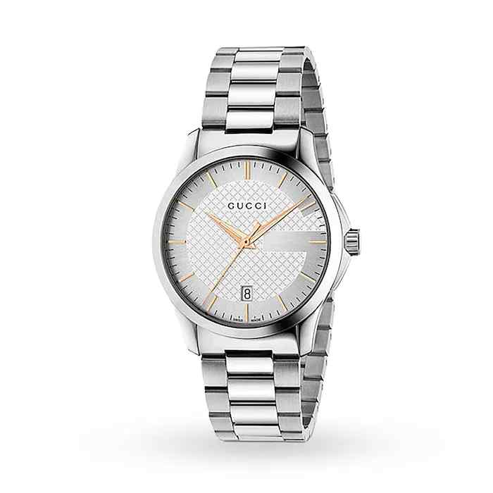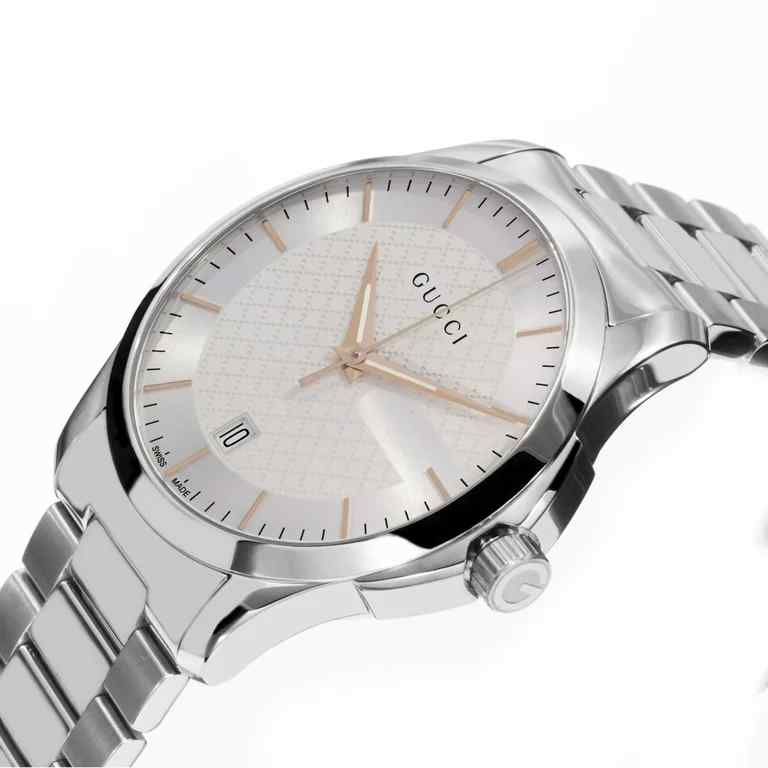 The Gucci G-Timeless (YA126442) is a refined and versatile timepiece that embodies contemporary luxury with a subtle nod to brand heritage. This 38mm unisex watch is expertly crafted from polished stainless steel, including its sleek case and the seamlessly integrated H-link bracelet. The captivating silver sun-brushed dial is the focal point, featuring a unique Gucci “G” motif pattern that adds depth and brand identity. Rose gold-tone baton indices and hands ensure clear legibility, while a practical date display is positioned at 6 o’clock. Protected by a durable sapphire crystal and driven by a reliable Swiss quartz movement, this piece offers a sophisticated, understated aesthetic that is perfect for any occasion, from formal events to daily wear.