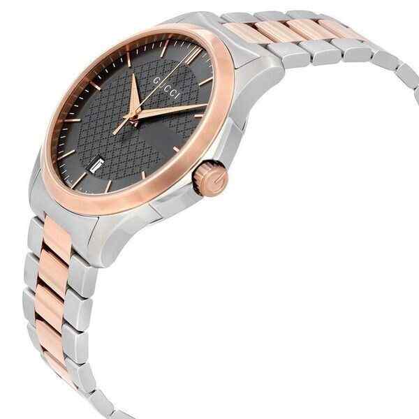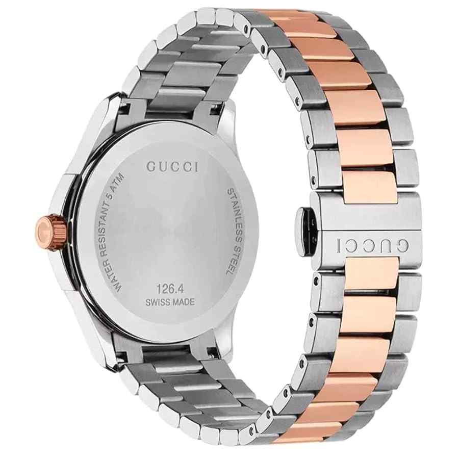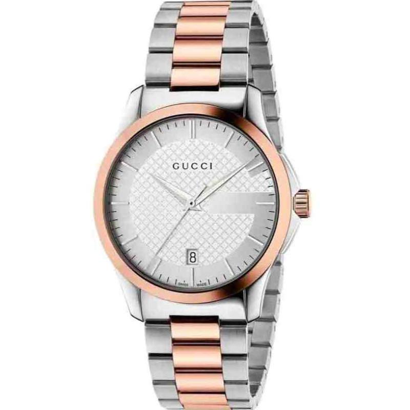 The Gucci G-Timeless (YA126447) is a refined and versatile timepiece that perfectly blends classic elegance with modern two-tone aesthetics. This 38mm unisex watch is expertly crafted from polished stainless steel, complemented by a luxurious rose gold PVD-plated bezel and matching central links on its H-link bracelet. The captivating silver sun-brushed dial is the focal point, featuring a unique Gucci “G” motif pattern that adds depth and brand identity. Silver-tone baton indices and hands ensure clear legibility, while a practical date display is positioned at 6 o’clock. Protected by a durable sapphire crystal and driven by a reliable Swiss quartz movement, this piece offers a refined, contemporary appeal that is perfect for any occasion, from formal events to daily wear.