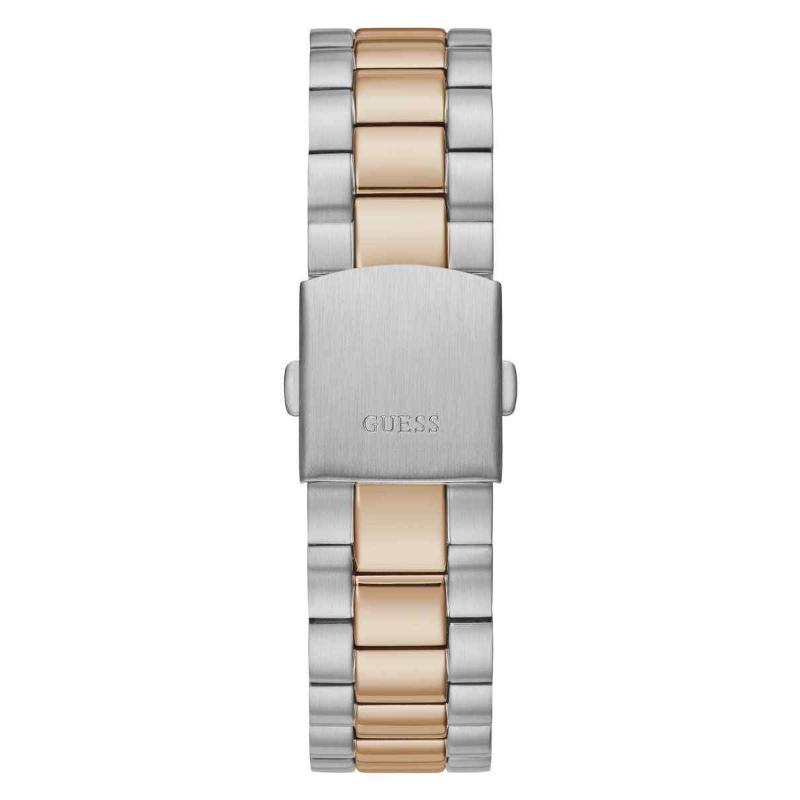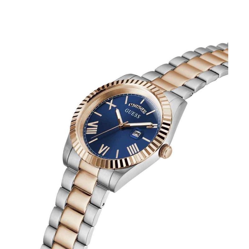 The Guess Connoisseur GW0265G12 is a commanding watch that blends mixed metals with a sporty aesthetic. This 42mm men’s watch features a polished stainless steel case with rose gold PVD accents on the bezel and central bracelet links. The vibrant blue dial provides a clear backdrop for the two sub-dials showing the day and date. This quartz-powered watch is water-resistant to 50 meters, making it a sophisticated and versatile accessory for the man who appreciates the warmth of rose gold combined with high-impact design.