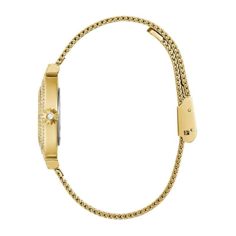 The luxurious Guess Dream GW0550L2 features a 36mm gold PVD-plated case, a dazzling gold sunray dial with crystal accents, and a fluid gold PVD Milanese mesh bracelet, epitomizing golden elegance.
