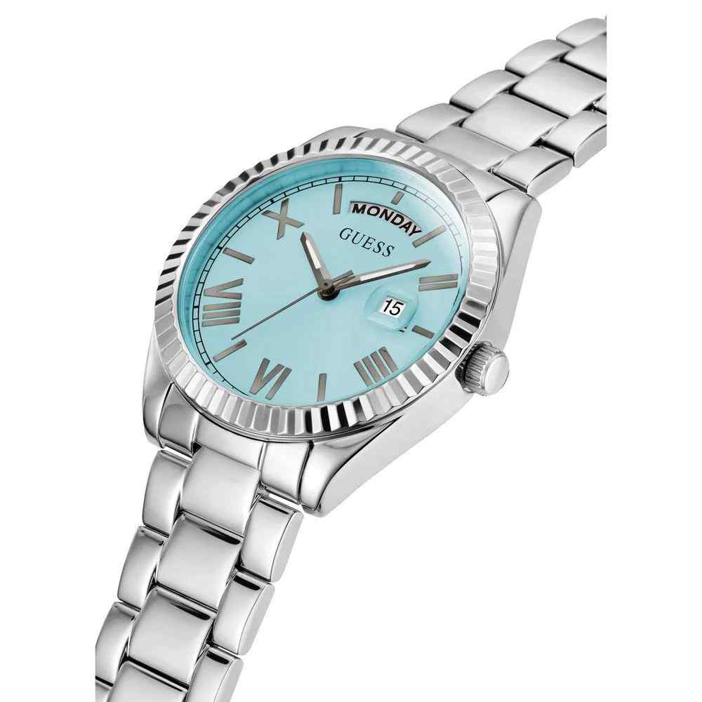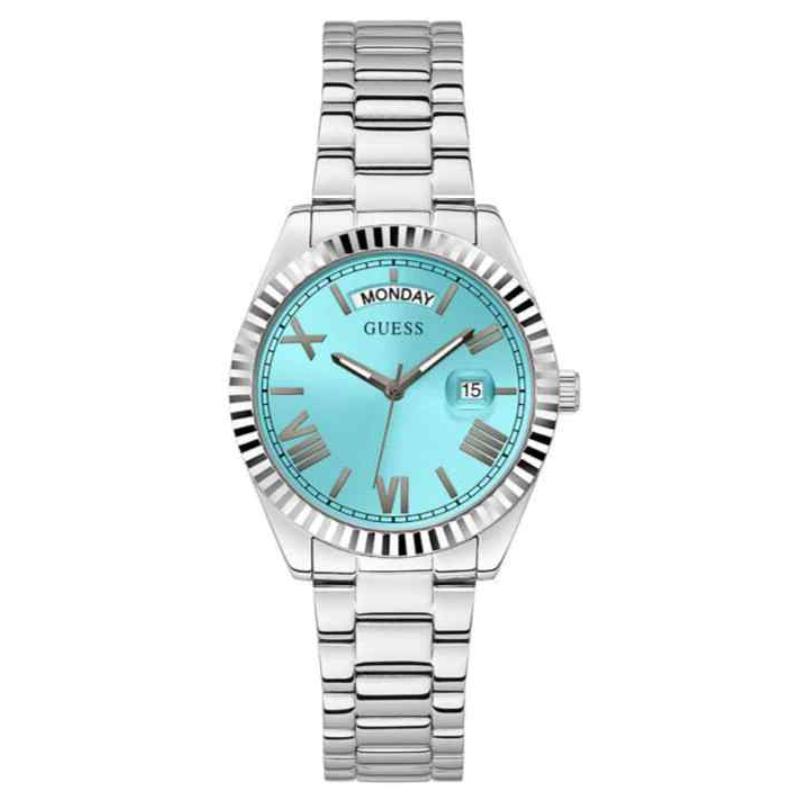 The Guess Luna GW0308L4 offers a classic two-tone aesthetic with enduring appeal. This 36mm ladies’ watch features a polished stainless steel case with yellow gold PVD accents on the bezel and bracelet links. The elegant silver dial is refined and legible, featuring Roman numeral indices and a date window. Powered by a reliable quartz movement and water-resistant to 30 meters, this Luna timepiece is a versatile, luxurious accessory that effortlessly blends different metal tones for a sophisticated, timeless look.