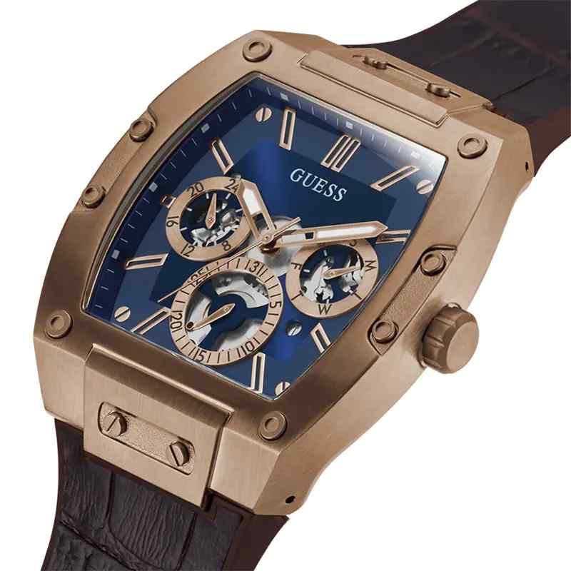 The Guess Phoenix GW0202G2 is a bold men’s timepiece known for its unique, architecturally inspired design (often compared to Richard Mille). This large 43mm watch features a polished stainless steel barrel-shaped case and a striking blue multifunction dial which includes sub-dials for day, date, and 24-hour time. The contrast is completed by a high-quality brown leather strap (sometimes described as a hybrid leather/silicone “FLEX” strap). Powered by a reliable quartz multifunction movement and water-resistant to 50 meters, this Phoenix model is designed for the modern man who values unique style and functional complexity.