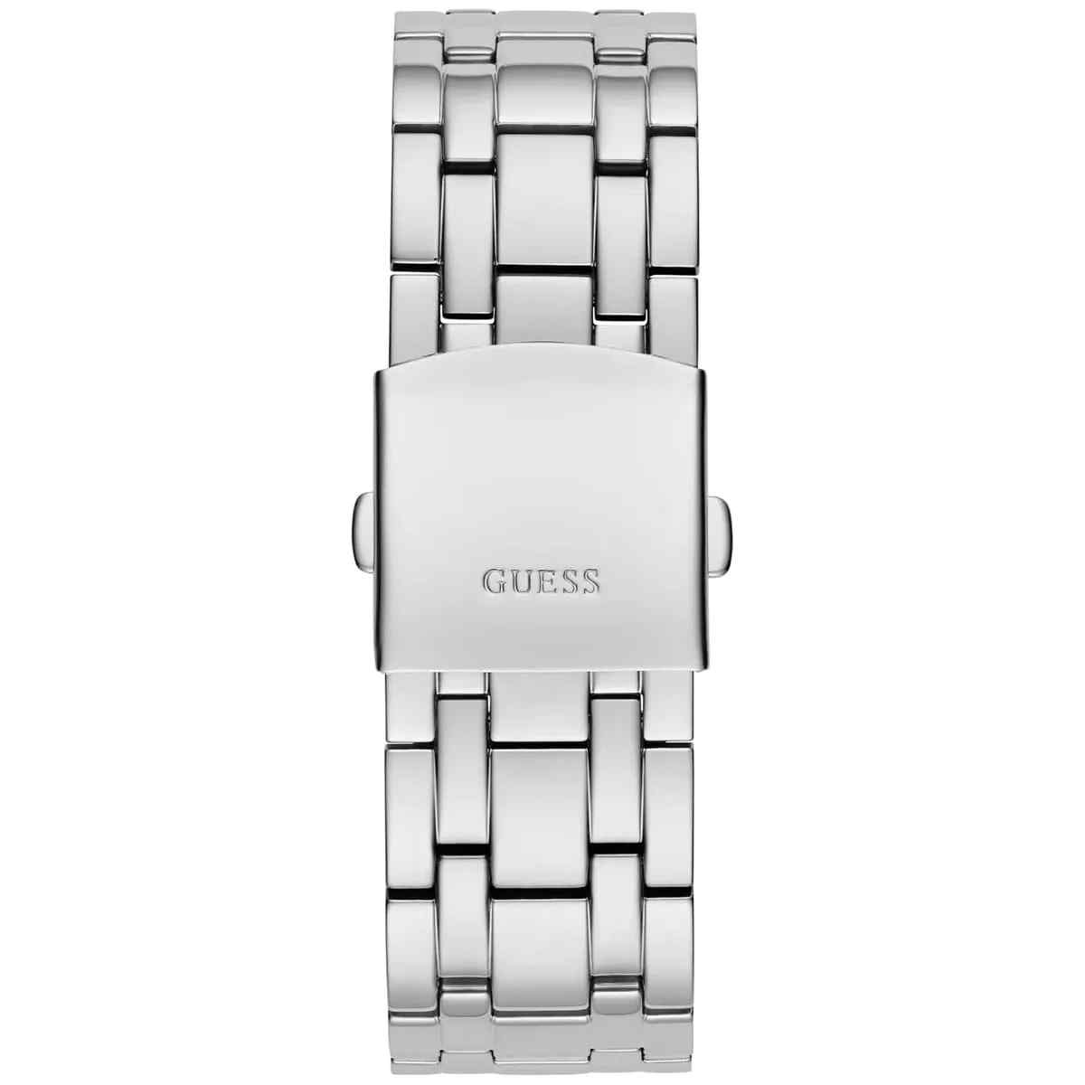 The Guess GW0455G1 is a bold and highly functional men’s timepiece with an aggressive, sporty design. This oversized 44mm watch is crafted from polished stainless steel with a matching integrated bracelet. The fixed bezel is ringed with rhinestone accents, adding a flash of luxury. The central feature is the striking silver multifunction dial which includes exposed gear details and provides day, date, and 24-hour timekeeping. Powered by a precise quartz multifunction movement and water-resistant to 50 meters, this watch is perfect for the man who seeks a reliable, feature-rich watch with an extravagant, modern flair.