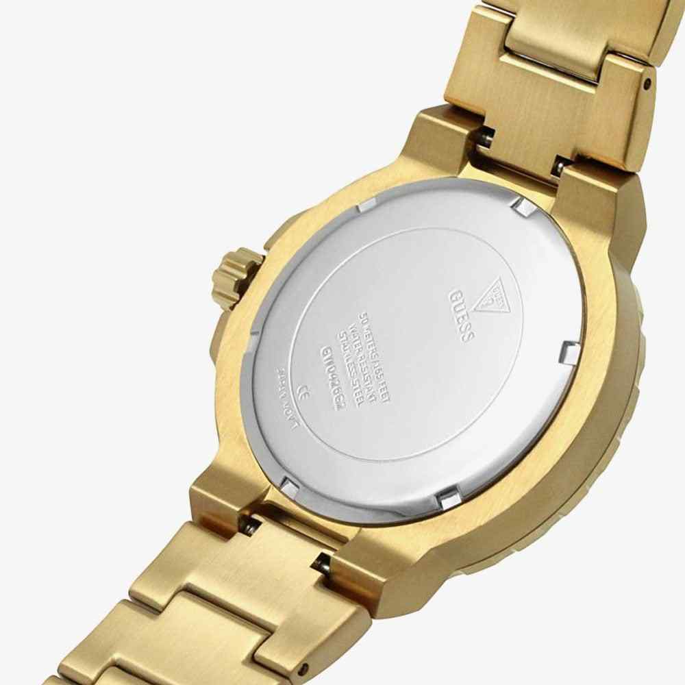 The Guess Track GW0426G2 is a statement men’s watch that commands attention with its golden finish. This substantial 44mm watch is crafted entirely from polished gold PVD-plated stainless steel, including its case and integrated bracelet. The fixed bezel frames a gold sunray dial with an intricately designed multi-layered texture. The dial features highly legible luminous hands and simple stick indices. Powered by a precise quartz movement and water-resistant to 50 meters, this Track timepiece is built for bold style and durability, making it an excellent, confident statement piece.