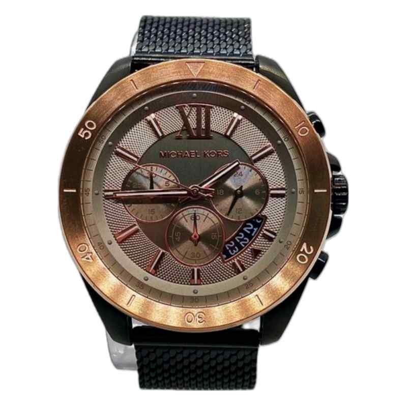 Elevate your everyday style with this sophisticated Michael Kors Brecken chronograph watch. Featuring a sleek grey dial with rose gold-tone accents, this timepiece offers a modern and masculine aesthetic. The chronograph sub-dials provide precise timekeeping, while the luminous hands and markers ensure easy readability in any lighting condition. Crafted from durable stainless steel, the watch boasts a comfortable mesh bracelet and a secure fold-over clasp. With its water resistance and scratch-resistant mineral crystal, this watch is perfect for daily wear.