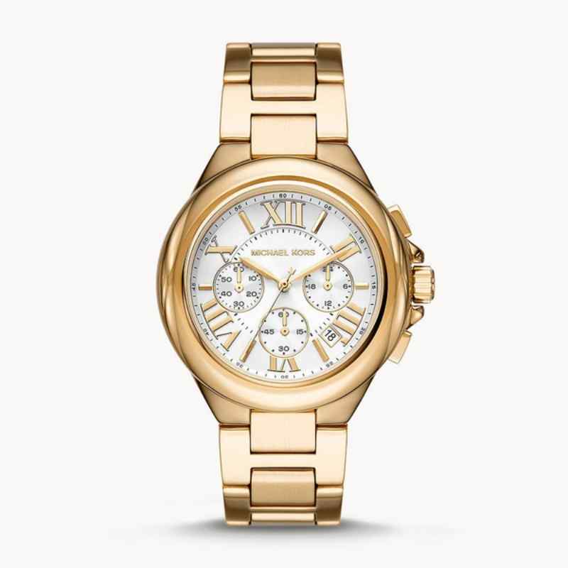 -60%Elevate your everyday style with this stunning Michael Kors Camille Chronograph watch. Featuring a sophisticated gold-tone stainless steel case and bracelet, this timepiece exudes timeless elegance. The crisp white dial showcases three chronograph subdials for precise timekeeping, adding a touch of sporty chic. With a generous 43mm case size, this watch makes a bold statement without being overwhelming. Perfect for any occasion, the Michael Kors Camille is a must-have for the modern woman.