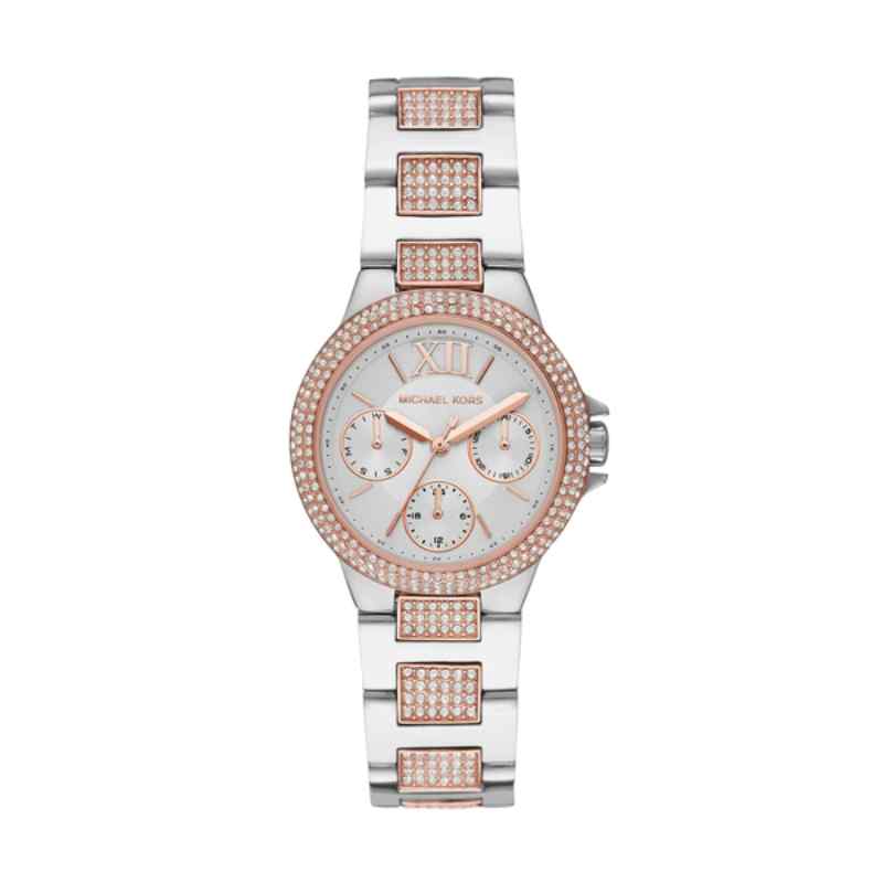 -60%Elevate your everyday style with the Michael Kors Camille watch (MK6846). This sophisticated timepiece features a 33mm stainless steel case with rose gold accents, creating a two-tone design that’s both classic and modern. The crisp white dial showcases a minimalist three-hand design for easy timekeeping, powered by a reliable quartz movement. The watch is completed with a stylish and comfortable two-tone stainless steel bracelet with rose gold-tone center links. Perfect for any occasion, the Camille watch adds a touch of understated elegance to your wrist.