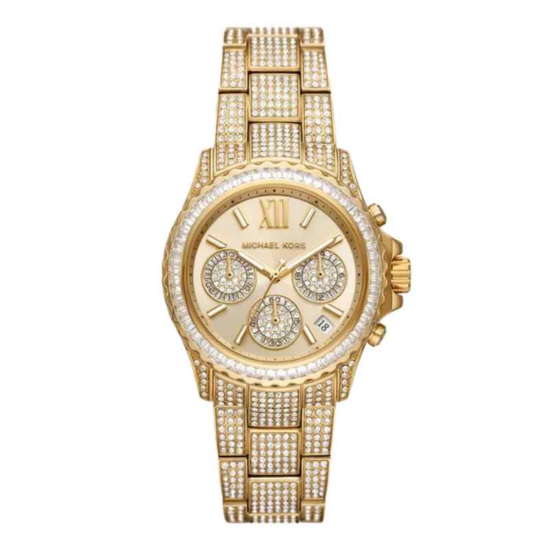 Elevate your everyday style with this stunning Michael Kors Everest Chronograph watch. This sophisticated timepiece boasts a 36mm gold-tone stainless steel case adorned with a crystal-set bezel, adding a touch of glamour to any outfit. The scratch-resistant mineral glass protects the gold dial featuring gold-tone stainless steel hands and three gem-set sub-dials for tracking hours, minutes, and seconds. A convenient date window is positioned between the 4 and 5 o’clock markers. The 20mm gold-tone stainless steel bracelet, also embellished with crystals, secures comfortably with a push-button folding clasp.