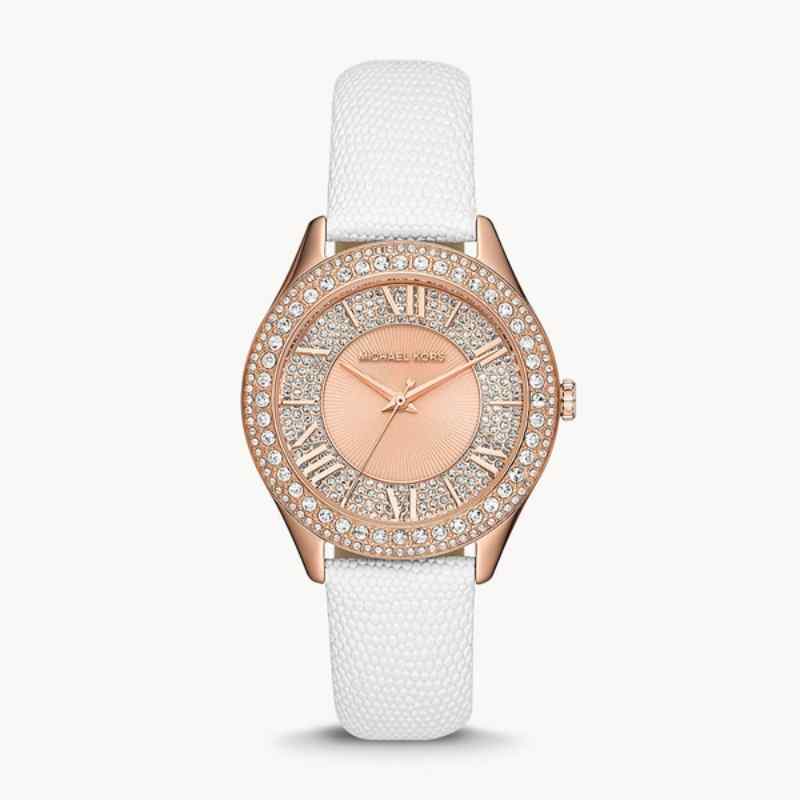 Michael Kors Harlowe Three Hand White Lizard Embossed Leather Women’s Watch MK2989