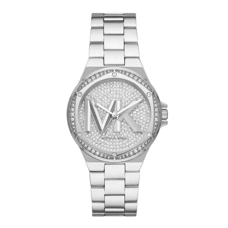 Elevate your everyday style with this sophisticated Michael Kors Lennox watch. Featuring a dazzling pave crystal bezel and a sleek silver-tone finish, this timepiece is the perfect blend of glamour and practicality. The 37mm case houses a crystal silver dial with silver-tone hands and the iconic MK logo, offering a clean and modern look.