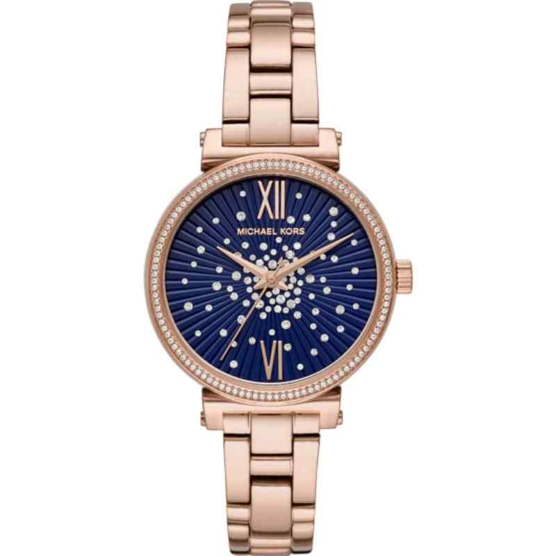 -60%Rose gold-tone stainless steel case and bracelet. Fixed rose gold-tone bezel set with crystals. Blue (crystal-set) dial with rose gold-tone hands. Roman numerals appear at the 6 and 12 o’clock positions. Dial Type: Analog. Quartz movement.