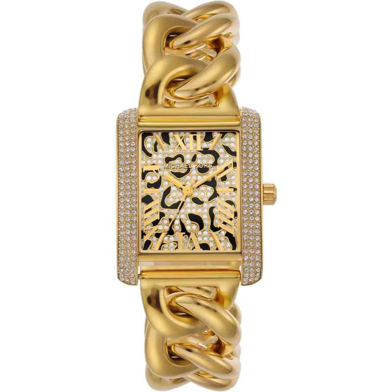 -60%Meet Emery: a wildly chic timepiece in a warm, opulent hue with pavé crystals and leopard-print enamel accents that make a sparkling statement. Roman numeral time stops add classic appeal, while the oversized curb-link strap offers a modern take on glamour. Consider it an essential for day or night.