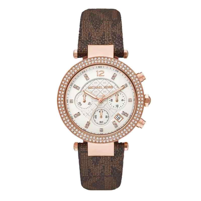 Elevate your everyday style with this sophisticated Michael Kors Parker Chronograph watch. Featuring a stunning rose gold-tone stainless steel case adorned with sparkling crystals, this timepiece is the perfect blend of glamour and functionality. The crisp white dial showcases rose gold-tone hands, markers, and the iconic MK logo, while three sub-dials and a date window at 4:30 provide precise timekeeping. The comfortable brown silicone strap adds a touch of modern chic and secures with a pin buckle closure.