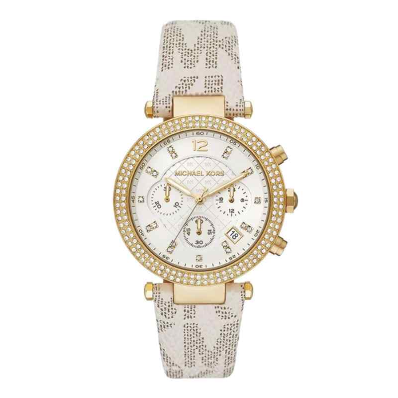 Elevate your everyday style with this sophisticated Michael Kors Parker Chronograph watch. Featuring a pristine white silicone strap and a gleaming gold stainless steel case, this timepiece offers a chic and modern aesthetic. The 39mm case houses a white dial adorned with gold-tone hands, markers, and the iconic MK logo. Three sub-dials track seconds, minutes, and hours, while a date window sits discreetly at the 4:30 position. The bezel is beautifully embellished with crystals, adding a touch of sparkle to this versatile design.