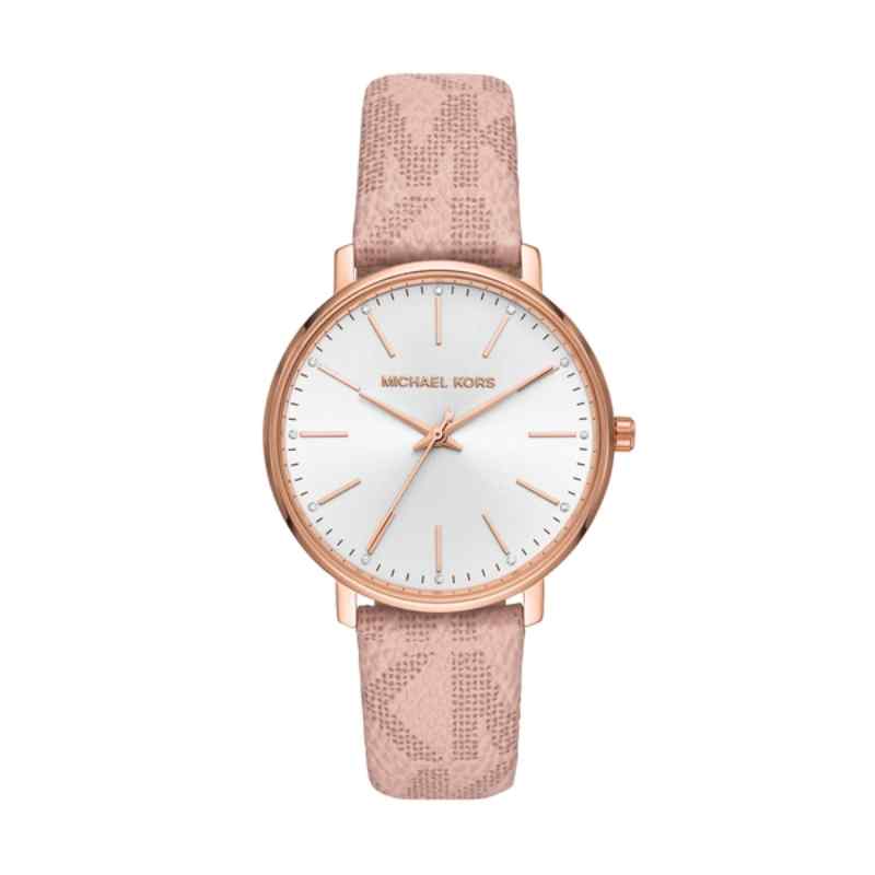 Elevate your everyday style with this sophisticated Michael Kors Pyper watch (MK2859). Featuring a classic 38mm stainless steel case and a beautiful white dial, this timepiece offers a timeless appeal. The sleek pink leather strap adds a touch of feminine charm and secures comfortably on the wrist. Powered by a reliable quartz movement, the Pyper ensures accurate timekeeping. Its minimalist three-hand design exudes understated elegance, making it perfect for both casual and formal occasions.