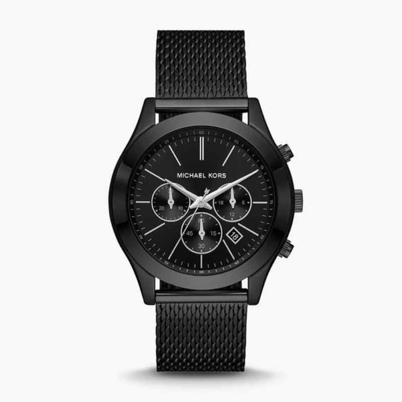 -60%Elevate your style with this sophisticated Michael Kors Slim Runway Chronograph watch. Featuring a sleek 44mm black stainless steel case and a comfortable black stainless steel mesh bracelet, this timepiece exudes modern elegance. The black dial features chronograph subdials for precise timekeeping, driven by a reliable quartz movement. With its water resistance, this watch is perfect for everyday wear.