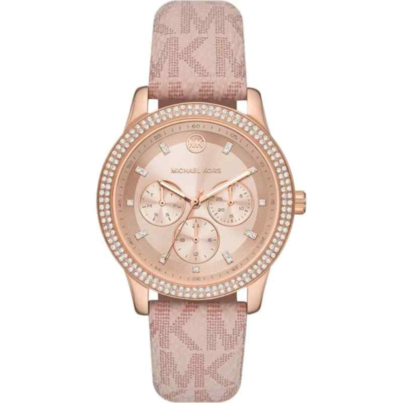 Elevate your everyday style with this sophisticated Michael Kors Tibby watch. Featuring a stunning rose gold-tone stainless steel case and a crystal-set bezel, this timepiece adds a touch of glamour to any outfit. The 40mm case houses a clear, rose gold dial with rose gold-tone hands and three sub-dials for hours, minutes, and seconds, along with a convenient date window at the 5 o’clock position. A soft pink leather strap complements the rose gold tones and provides comfortable all-day wear.