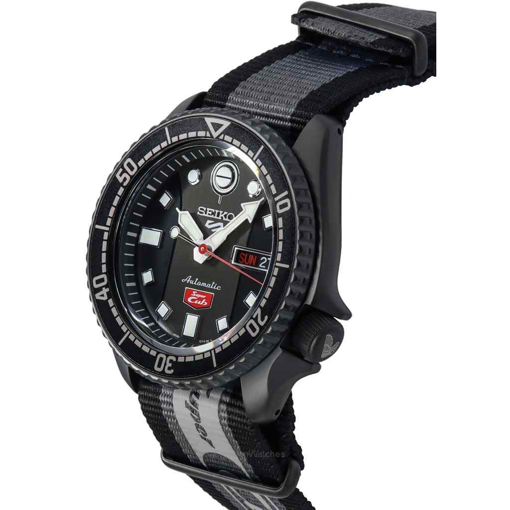 Ride in style with the Seiko 5 Sports SRPJ75K1 Super Cub Limited Edition! This unique automatic watch features a black dial with Super Cub motifs, a stealthy black case, and a custom grey and black NATO strap. A must-have collectible for fans of Seiko and Honda. Get this limited edition at easy-watches.com!