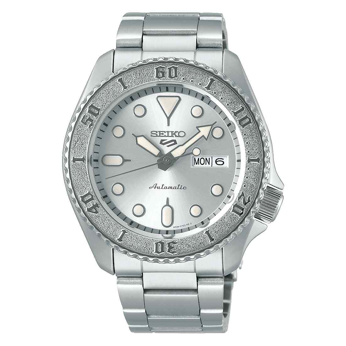 The SRPE71K1 immediately captivates with its elegant silver-tone dial, which provides a sleek backdrop for its luminous hands and markers, ensuring clear readability in any condition. The dial is perfectly complemented by a unique textured silver-tone unidirectional rotating bezel, which adds a touch of modern flair and practical functionality for timing various activities.