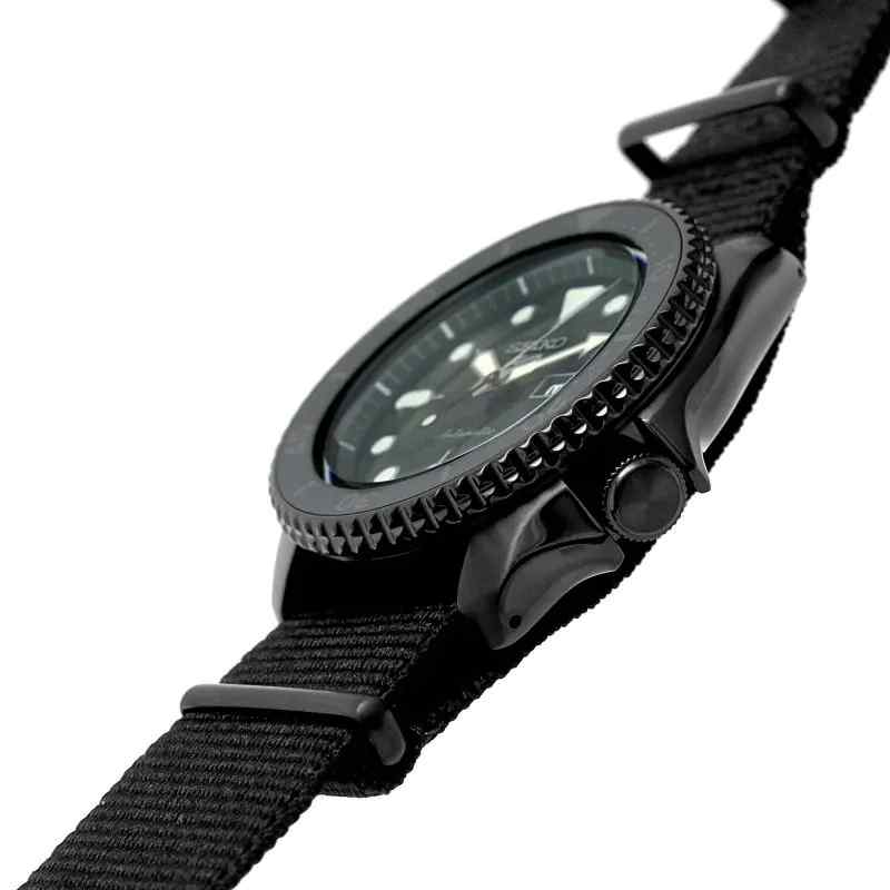 The SRPJ37K1 features a truly unique and eye-catching green camouflage dial, which instantly sets it apart. The pattern provides an adventurous backdrop for its luminous hands and markers, ensuring clear readability in various conditions. The watch is framed by a sleek black unidirectional rotating bezel, complementing the stealthy appeal of the black hard-coated stainless steel case.
