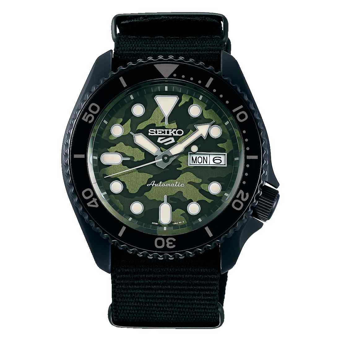 Powered by a reliable automatic movement, this watch harnesses the natural motion of your wrist, eliminating the need for batteries and embodying traditional watchmaking craftsmanship. The timepiece is secured by a comfortable and durable black NATO strap, which further enhances its utilitarian charm and ensures a secure fit during any activity. Complete with a convenient day/date display and LumiBrite for superior visibility in low-light conditions, the Seiko 5 Sports SRPJ37K1 is more than just a watch; it’s a statement piece built for resilience and unmistakable style. Equip yourself with this exceptional camouflage watch from easy-watches.com.