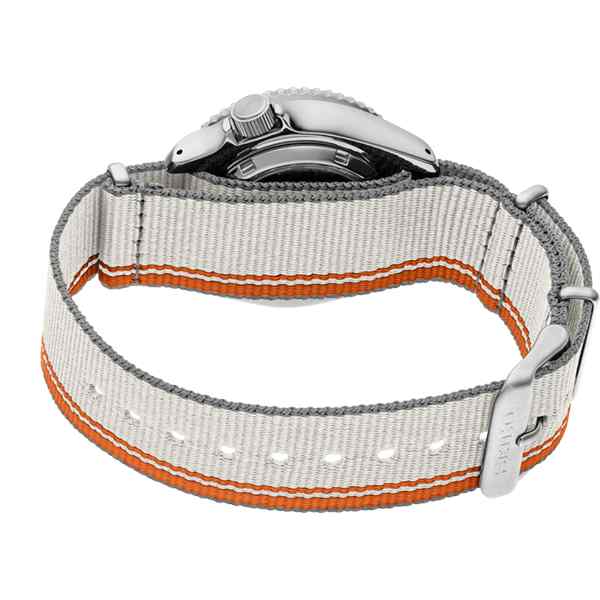 Its silver sunray dial is accented by a vibrant orange stripe that adds a unique, energetic touch. The design is balanced with luminous hands and markers, ensuring legibility in all lighting conditions. Housed in a stainless steel case and fitted with a NATO-style strap featuring matching orange detailing, the SRPK73K1 offers both comfort and character.