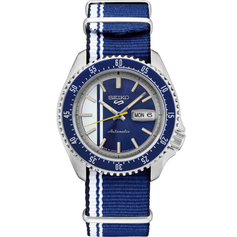 Its deep blue dial accented by a vertical white stripe gives the watch a distinctive military aesthetic, perfectly complemented by a blue and white NATO strap for comfort and versatility. The dial features luminous hands and markers for easy reading in any light, along with a day/date display at 3 o’clock for everyday convenience.