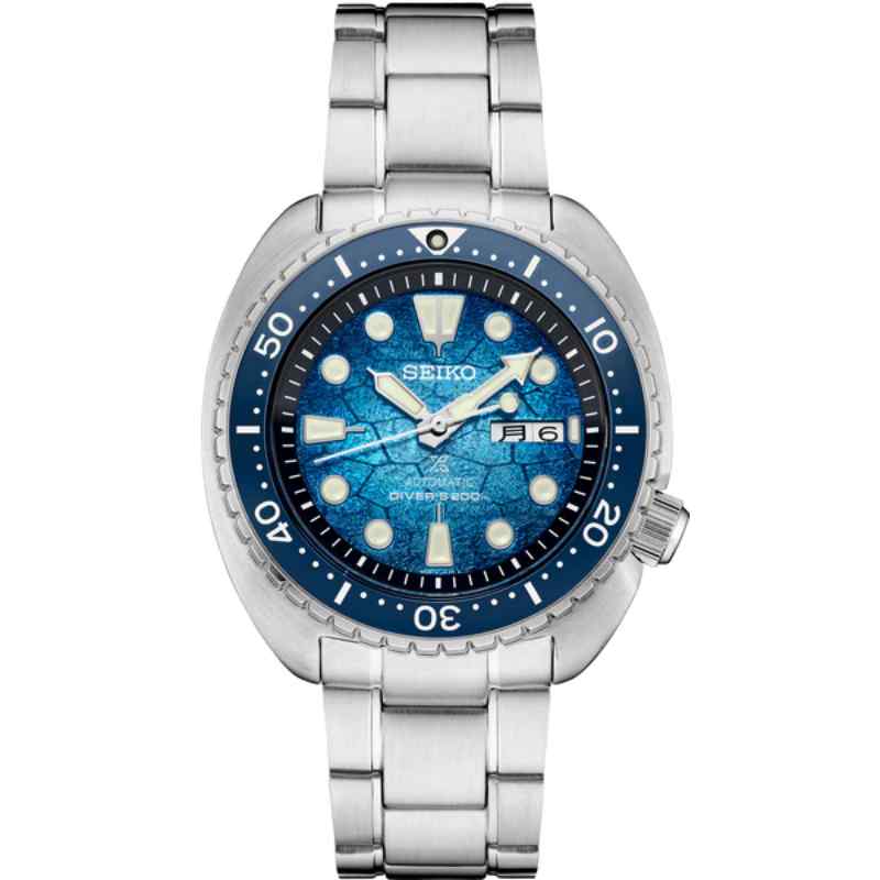 Designed for those who treat life as the ultimate adventure, Seiko Prospex keeps moving forward, meeting every challenge with technological excellence and winning design. With an intricately patterned blue dial inspired by turtle shells, this exciting Special Edition celebrates Prospex’s ongoing efforts to promote ocean exploration and conservation. For reliable timing in rough waters, the 24-jewel automatic movement, which beats at a frequency of 21,600 vibrations per hour, provides a power reserve of approximately 41 hours and offers manual winding capability.