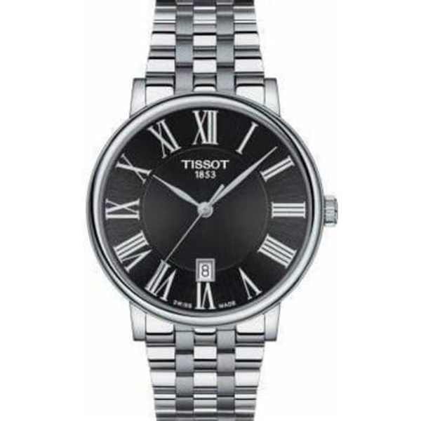 Elevate your everyday style with the timeless Tissot T-Classic Carson. This sophisticated men’s watch features a sleek 40mm stainless steel case and a polished silver stainless steel bracelet, secured with a convenient deployment clasp with push-button release. The striking black dial is accented by silver Roman numeral hour markers and hands, offering a classic and legible display. Beneath the scratch-resistant sapphire crystal lies a precise quartz movement, ensuring accurate timekeeping and effortless maintenance. With a date display at the 6 o’clock position and water resistance up to 50 meters (165 feet), this versatile timepiece is perfect for both formal occasions and everyday wear.